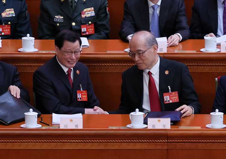最高人民法院院长张军(右)和最高人民检察院检察长应勇(左)握手。