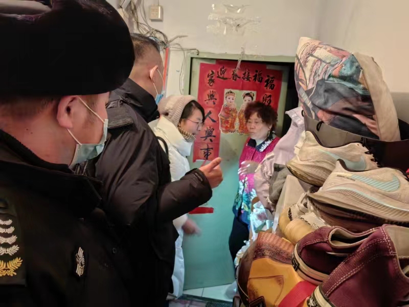 联合清查队工作人员就堆放杂物问题对居民进行提示。图源:海淀区消防救援支队
