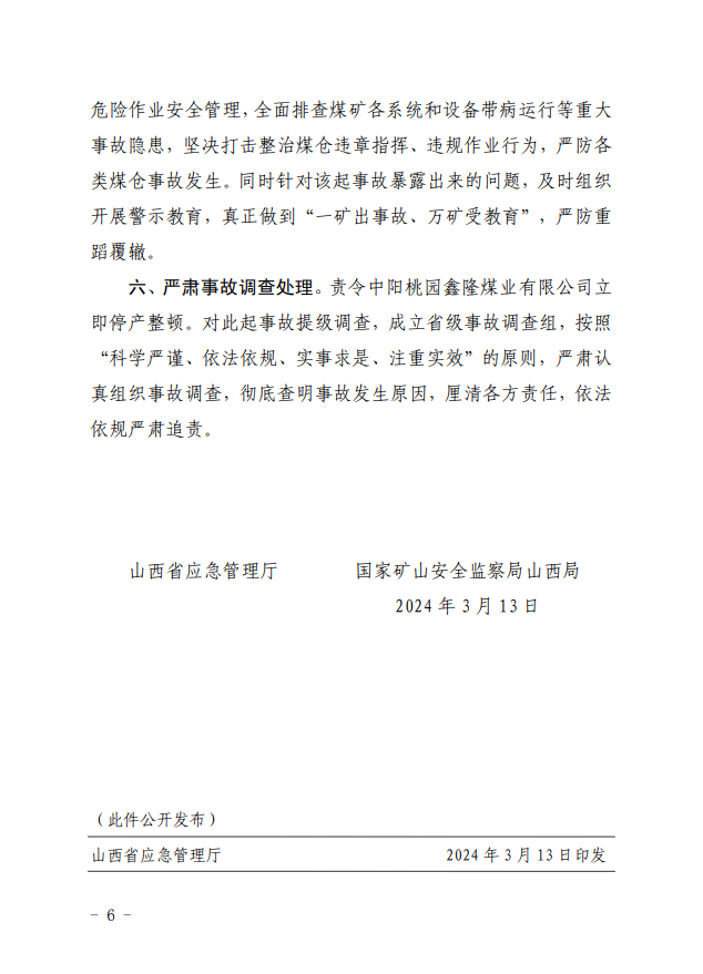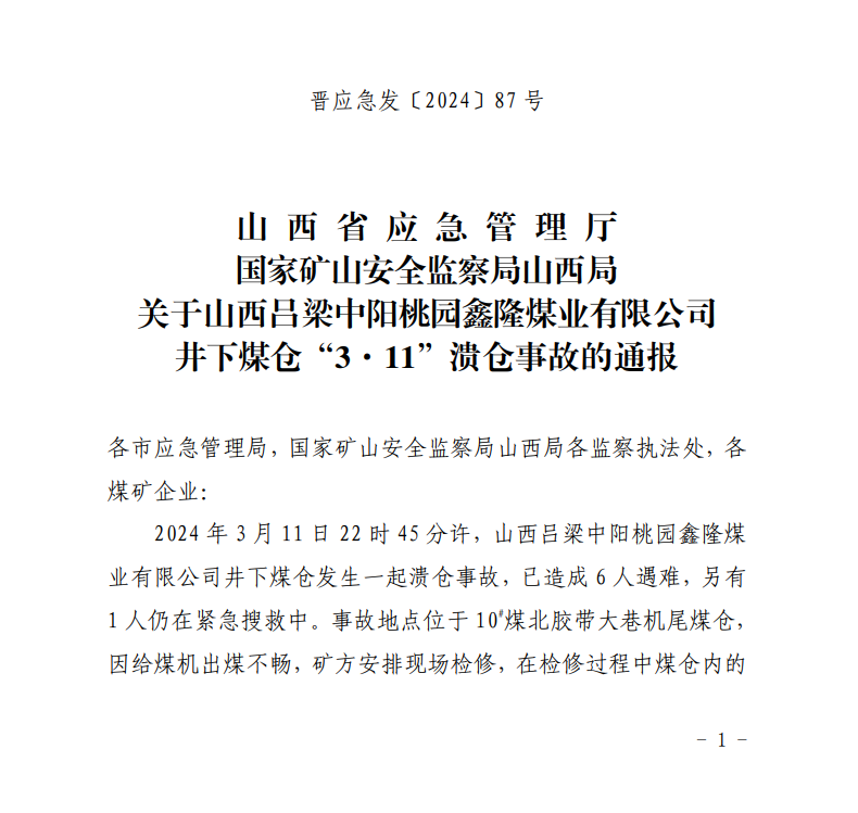 山西省应急管理厅 国家矿山安全监察局山西局 关于山西吕梁中阳桃园鑫隆煤业有限公司井下煤仓“3·11”溃仓事故的通报