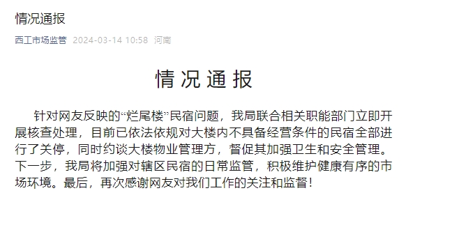 新京报讯 据河南洛阳市西工区市场监督管理局微信公众号西工市场监管消息,针对网友反映的“烂尾楼”民宿问题,我局联合相关职能部门立即开展核查处理,目前已依法依规对大楼内不具备经营条件的民宿全部进行了关停,同时约谈大楼物业管理方,督促其加强卫生和安全管理。下一步,我局将加强对辖区民宿的日常监管,积极维护健康有序的市场环境。最后,再次感谢网友对我们工作的关注和监督!