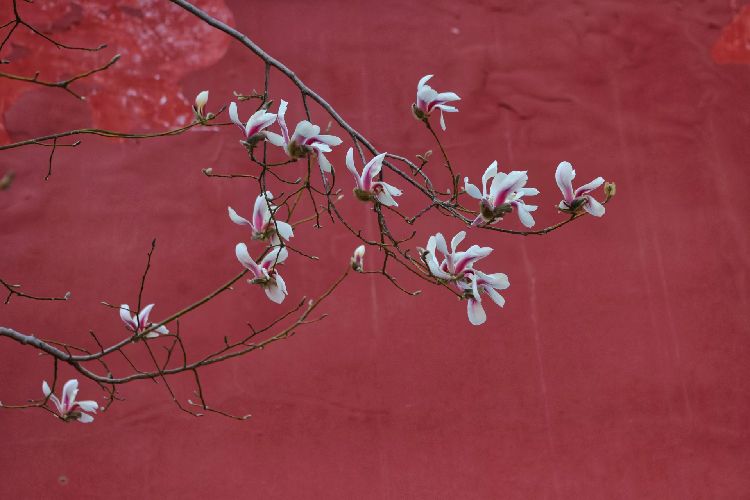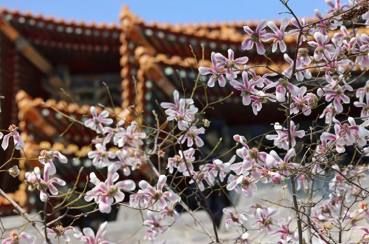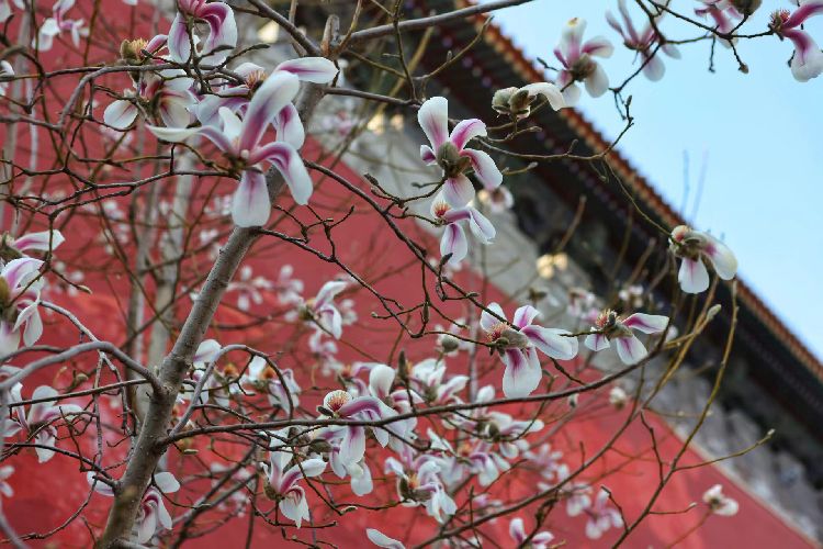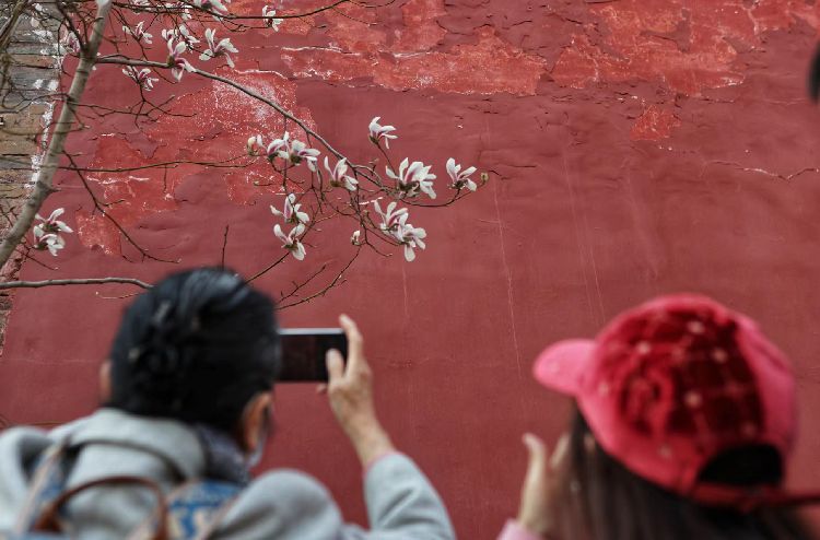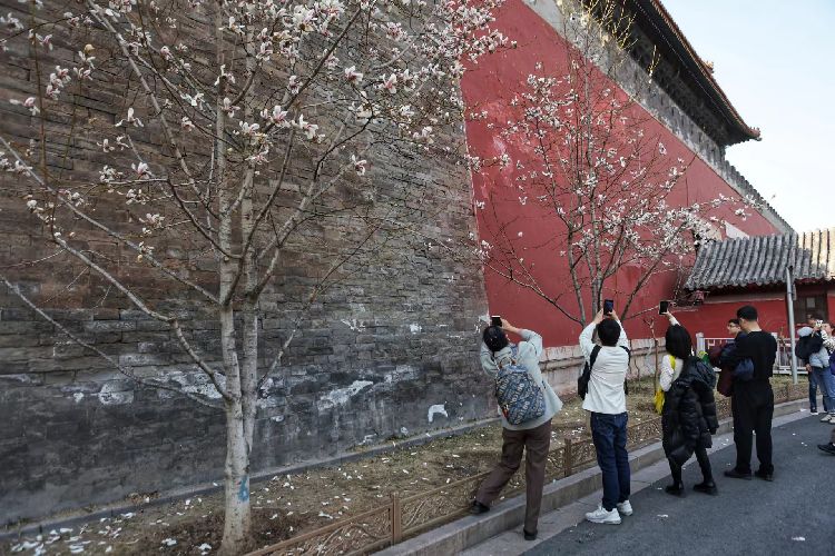 3月14日,故宫东华门外,盛开的玉兰花吸引了大批游客打卡拍照。