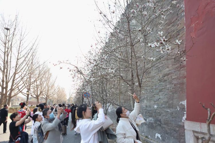故宫东华门外,众多市民、游客和摄影爱好者围着玉兰花拍照。