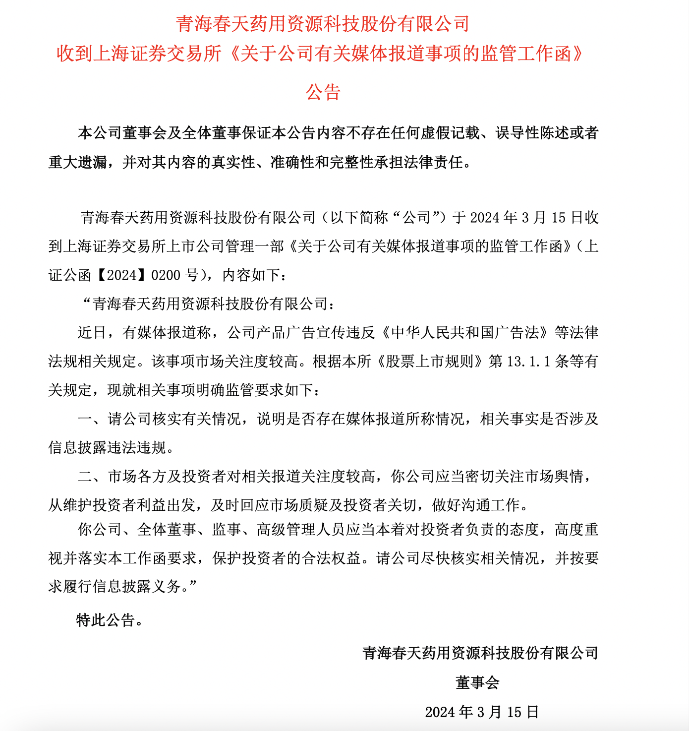 市场各方及投资者对相关报道关注度较高,上交所要求青海春天密切关注市场舆情,从维护投资者利益出发,及时回应市场质疑及投资者关切,做好沟通工作。尽快核实相关情况并按要求履行信息披露义务。