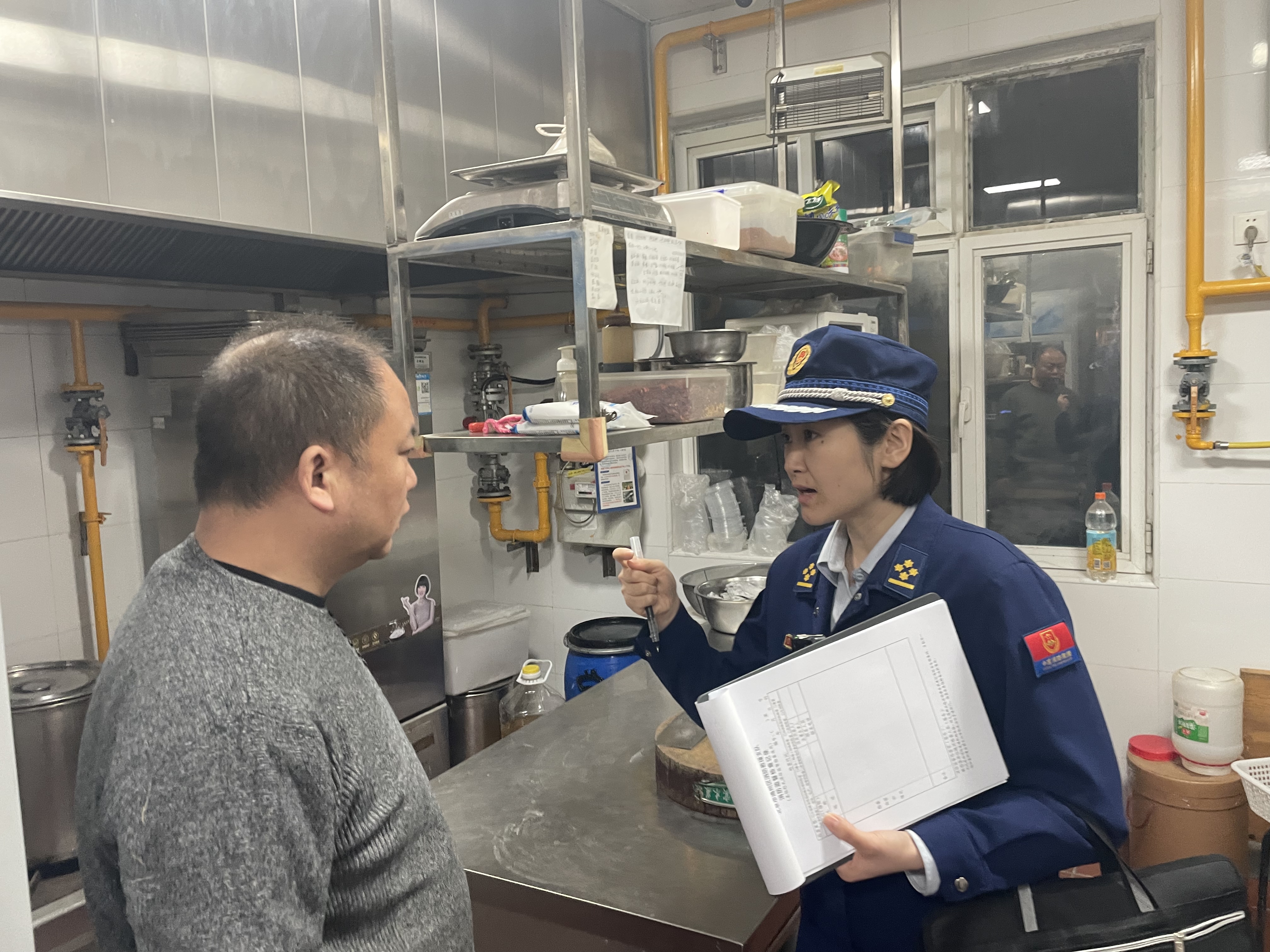 消防监督员督促后厨人员定期进行燃气设备自查。 图源:通州区消防救援支队