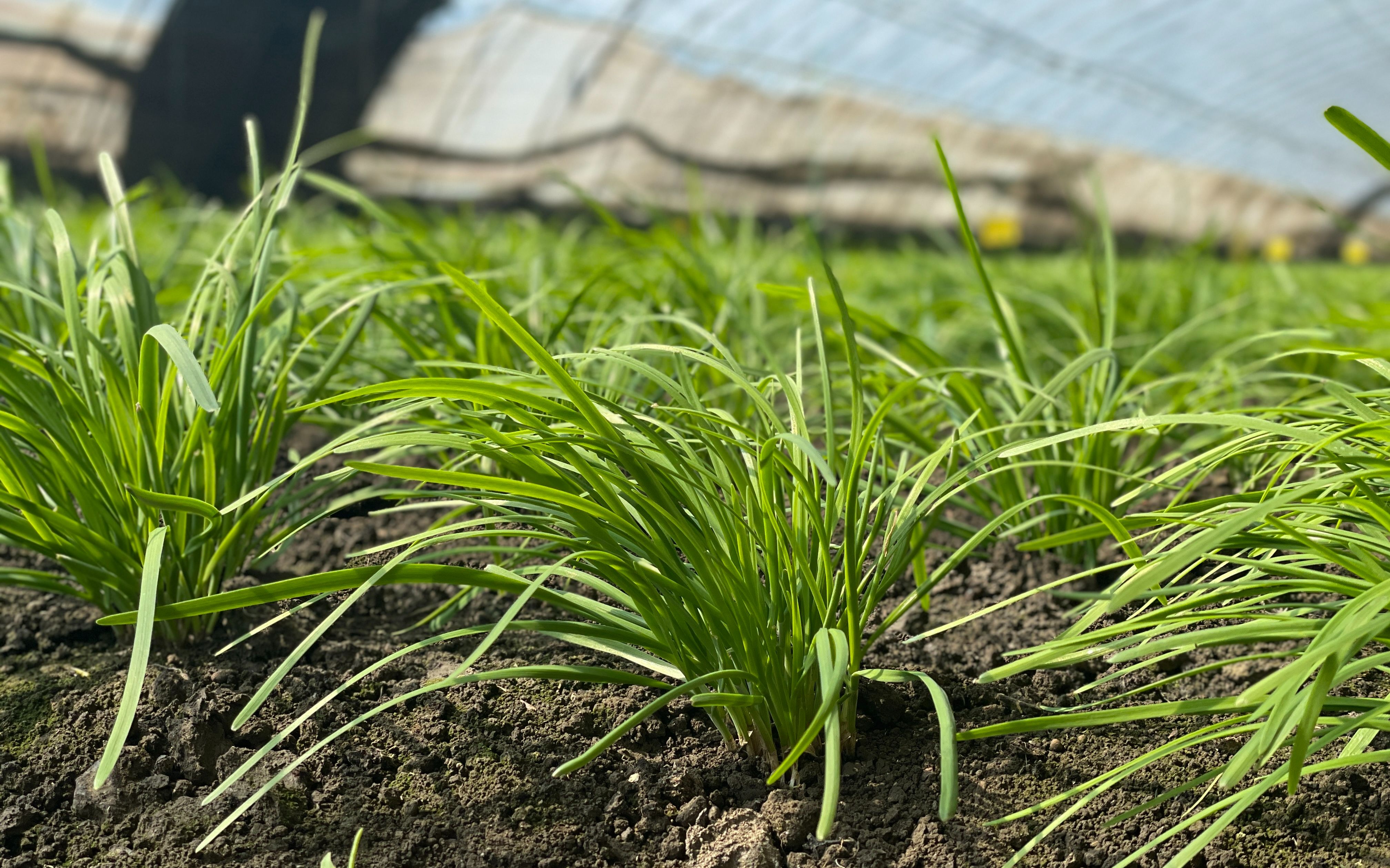 打开“芦西园”内韭菜温室的大门,“身高”没过脚踝的韭菜,从眼前一直延伸至看不见的远处。在高高的田垄上,韭菜的排列整齐,一簇簇间保持着几乎等距的间隔。韭菜的颜色鲜绿,更像初春原野上的青草,叶片细长,宽度要比人们传统印象中的韭叶稍大些,有的已经如小手指一般宽。要是掐断一片韭叶,放在两手上前后搓磨,便有清新的韭菜鲜香久久萦绕在鼻尖。