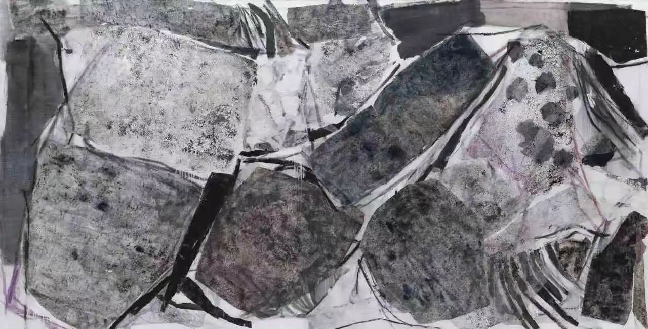 “山水赋系列”中,顾黎明还开始尝试融入民艺撕纸的方式拼贴画面。无论是山的形象还是水的律动,都蕴含着中国传统文化艺术带给他的灵感和滋养,在交织的线条和色彩中,通过笔触与色彩触发纸性的内在魂魄,生成多意切换空间。正如他自己所言:“这些痕迹可以勾起我们对历史情怀的眷恋,同样也能够反映我们现实的境遇”。