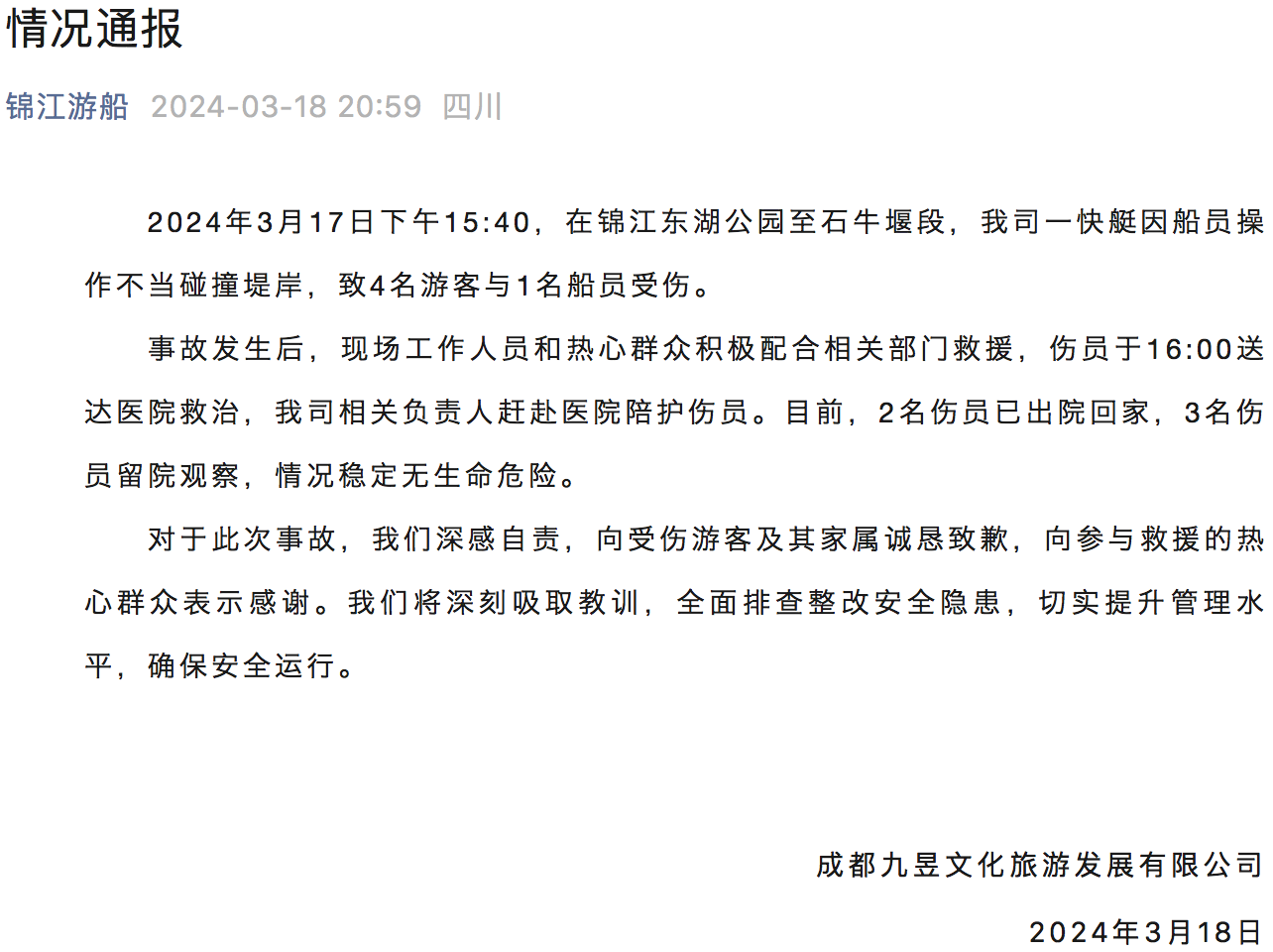 成都一快艇撞上锦江堤岸致5人受伤,涉事公司公开道歉