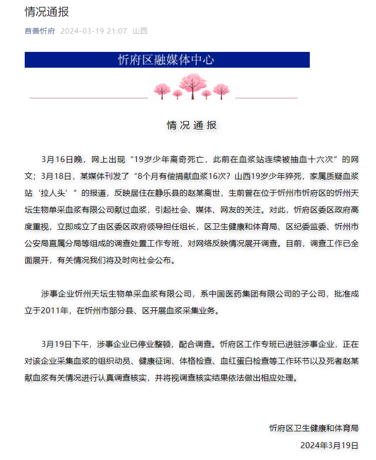 新京报讯 据山西忻州忻府区宣传部官微消息,3月16日晚,网上出现“19岁少年离奇死亡,此前在血浆站连续被抽血十六次”的网文;3月18日,某媒体刊发了“8个月有偿捐献血浆16次?山西19岁少年猝死,家属质疑血浆站‘拉人头’”的报道,反映居住在静乐县的赵某离世,生前曾在位于忻州市忻府区的忻州天坛生物单采血浆有限公司献过血浆,引起社会、媒体、网友的关注。对此,忻府区委区政府高度重视,立即成立了由区委区政府领导担任组长,区卫生健康和体育局、区纪委监委、忻州市公安局直属分局等组成的调查处置工作专班,对网络反映情况展开调查。目前,调查工作已全面展开,有关情况我们将及时向社会公布。