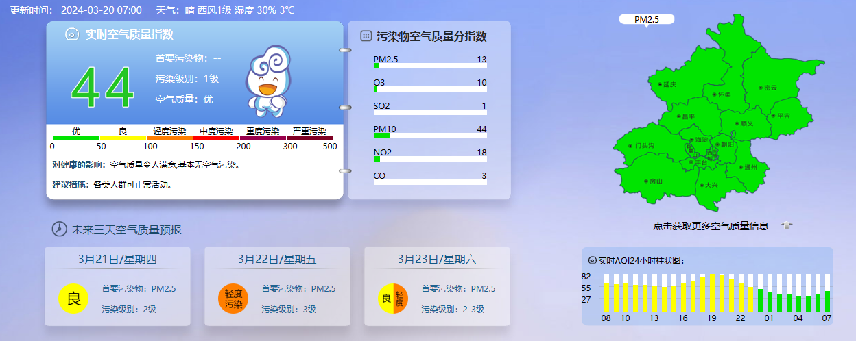 据北京市生态环境监测中心今早7时数据,目前实时空气质量指数44,空气质量优。