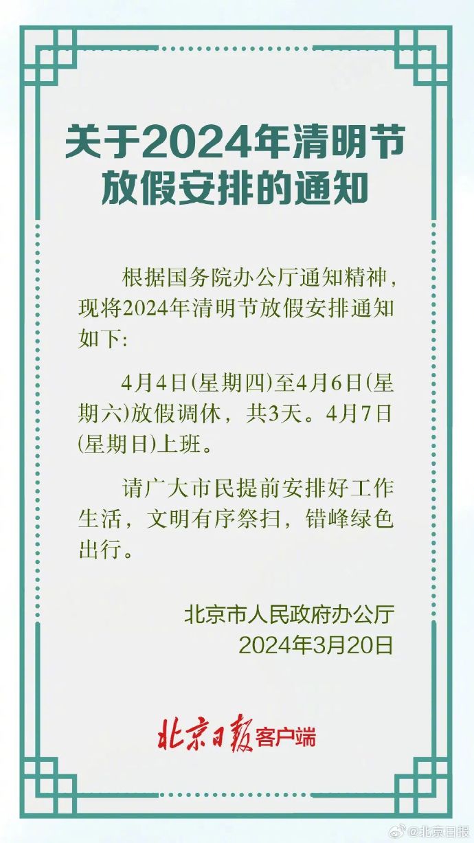 据北京日报消息,今天,北京市人民政府办公厅正式发布关于2024年清明节放假安排的通知。根据国务院办公厅通知精神,现将2024年清明节放假安排通知如下:4月4日(星期四)至4月6日(星期六)放假调休,共3天。4月7日(星期日)上班。请广大市民提前安排好工作生活,文明有序祭扫,错峰绿色出行。