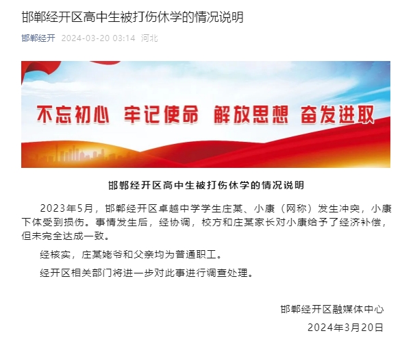 河北邯郸一高中生与同学发生冲突致下体受伤 官方通报