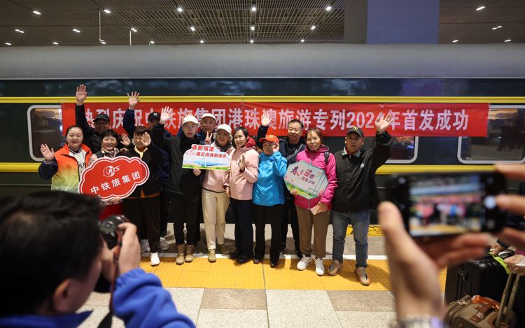 3月20日11时41分,Y427次旅游专列满载400余名游客从北京丰台站出发。本趟专列12天游历6省区市,旅客还能乘船打卡港珠澳大桥。图为旅客们在发车前合影。