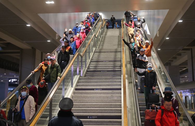 3月20日,旅客乘扶梯进入站台。中铁旅集团旅游专业分公司副总经理闫蕾介绍,中铁旅集团后续将推出更多铁路旅游产品,比如4月开行九寨沟旅游专列,5月开行“心连心·京藏号”旅游列车,7月、9月开行“京和号”旅游专列,10月开行额济纳方向旅游专列。
