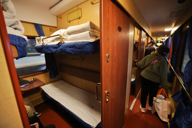 3月20日,旅客进入卧铺车厢。据北京车辆段相关负责人介绍,Y427次列车为16辆编组,其中包括14节卧铺车厢、1节餐车和1节发电车。列车出库前一周,北京车辆段对车内设备设施进行了高标准整修,保证作用良好。途中配备有5名车辆乘务员全程值乘,负责监控设备运转状态,为旅游专列车辆设备保驾护航。