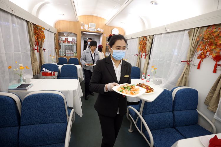 这趟旅游专列随车配备8名专业厨师和两名医护人员。11点半,8号餐车已开始供应午餐。