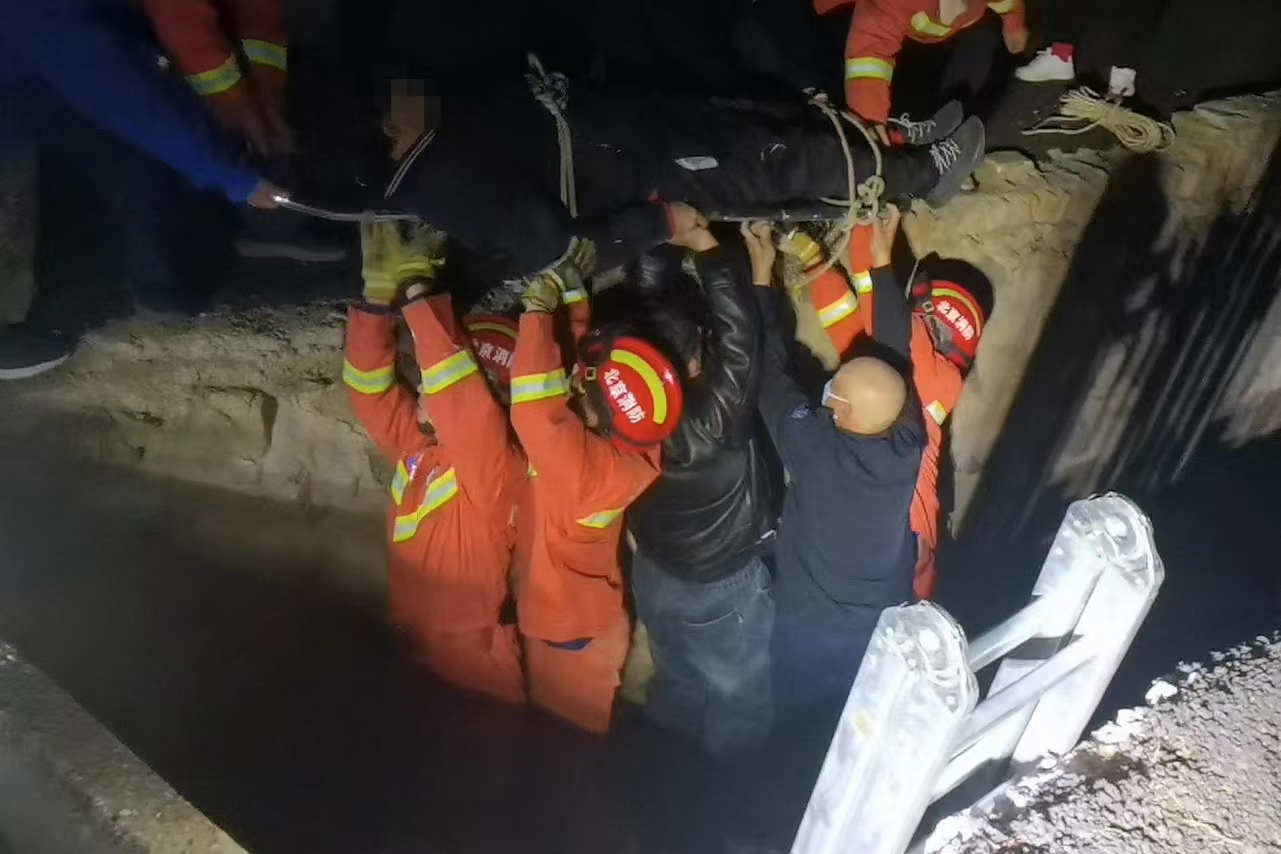 男子掉入2米深排水沟摔伤,北京密云消防抬担架救人
