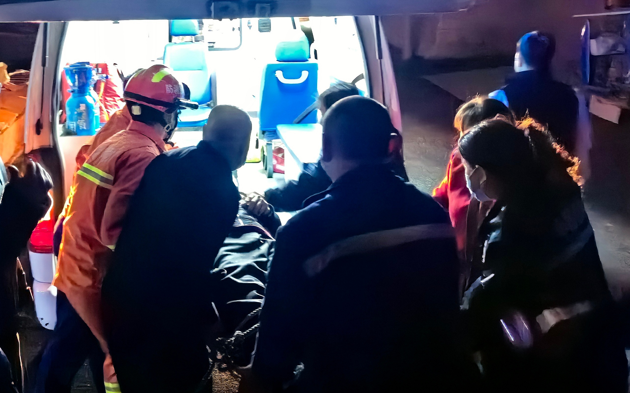 消防员在医护人员的指导下,小心翼翼将男子挪到担架上,并用绳索固定。随后几名消防员同时将担架举起,在村民的帮助下,合力将男子救出并转运到救护车上。