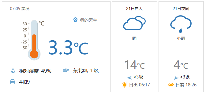 今日限行尾号为4和9。今天云量增多,下午至夜间有小雨,外出注意交通安全;昼夜温差大,早晚出行注意添衣保暖,谨防感冒。