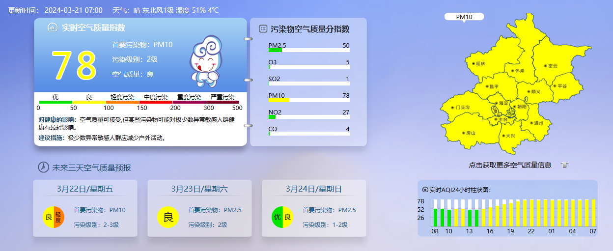 据北京市生态环境监测中心今早7时数据,目前实时空气质量指数78,首要污染物PM10,污染级别2级,空气质量良。