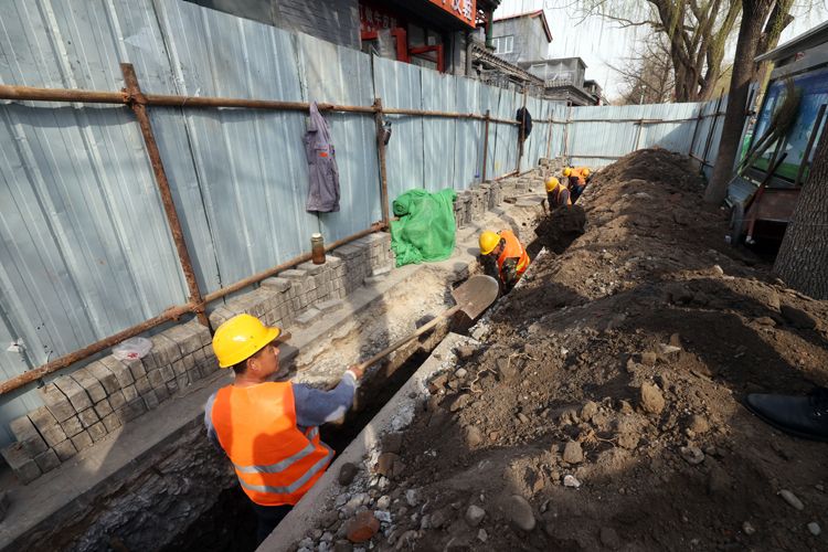 3月21日,朝阳门街道南小街,施工人员开挖排水管道。朝阳门南、北小街是核心区南北向的重要道路。全街系统化的环境整治提升将通过细化交通组织、改善市政设施、完善公共空间、优化街巷建筑立面等方式,营造以人为本、慢行优先、清朗有序的城市环境。