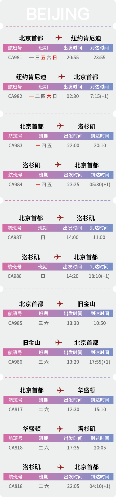 新京报讯 据“中国国际航空”消息,自2024年3月31日起,国航美国航线每周将增加3班,其中北京-纽约新增2班,航班号为CA981/2,机型为波音747;北京-洛杉矶新增1班,航班号为CA983/4,机型为波音777。届时,国航中美航线将增至每周14班,为往返中美旅客提供更多选择。国航14班中美航线如下: