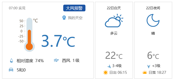 今天白天晴,局地有扬沙,北风一级转三四级,阵风六七级,最高气温22℃;夜间晴间多云,北风一二级,最低气温6℃。