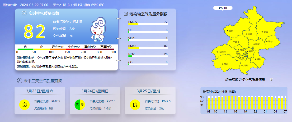 据北京市生态环境监测中心今早7时数据,目前实时空气质量指数82,首要污染物PM10,污染级别2级,空气质量良。