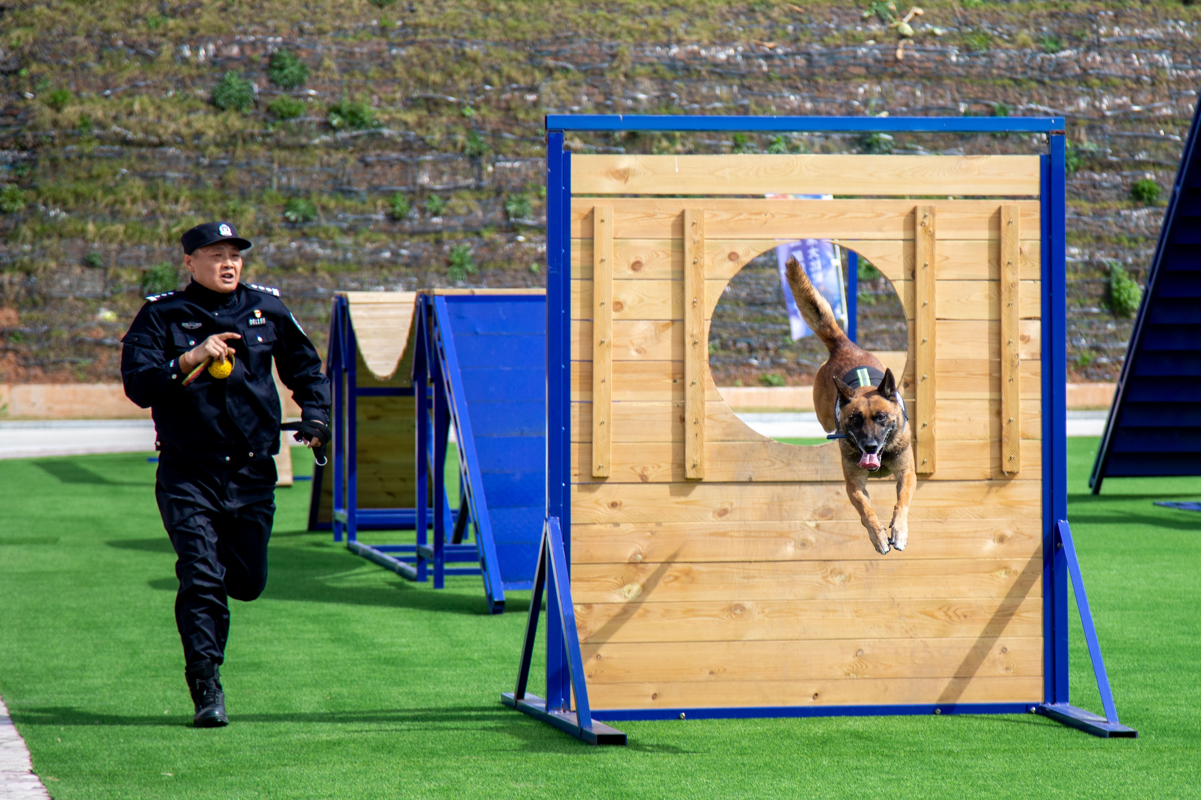 新京报记者了解到,开幕式上,30只初训合格的警犬在训导员的带领下整齐列队,受颁列装资格证书。全体人员还集中观看了人犬战术动作、警犬服从、跃障等科目表演及刑事案件处置实战应用综合演练。