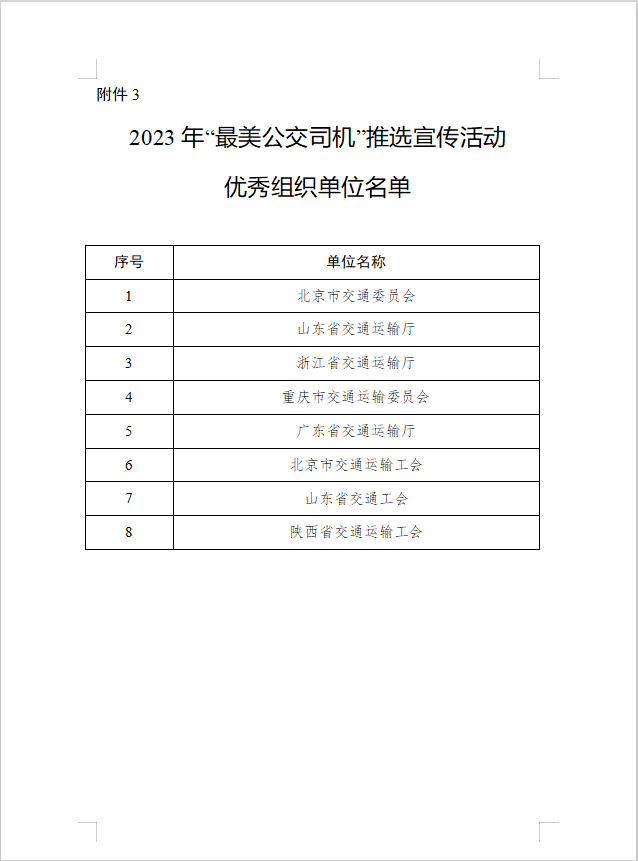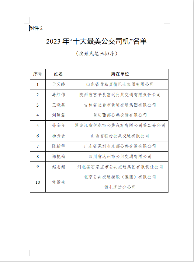 新京报讯 据交通运输部消息,为充分展现广大公交司机(含城市公共汽电车、城市轨道交通驾驶员)风采,营造尊重关爱公交司机的良好氛围,提升公交司机的职业荣誉感和行业归属感,促进城市公共交通高质量发展,交通运输部会同中华全国总工会联合开展了2023年“最美公交司机”推选宣传活动。经履行有关推选程序,现确定于二利等100名个人为2023年“最美公交司机”,其中于义睦等10名个人为2023年“十大最美公交司机”;确定北京市交通委员会等8家单位为推选宣传活动优秀组织单位。