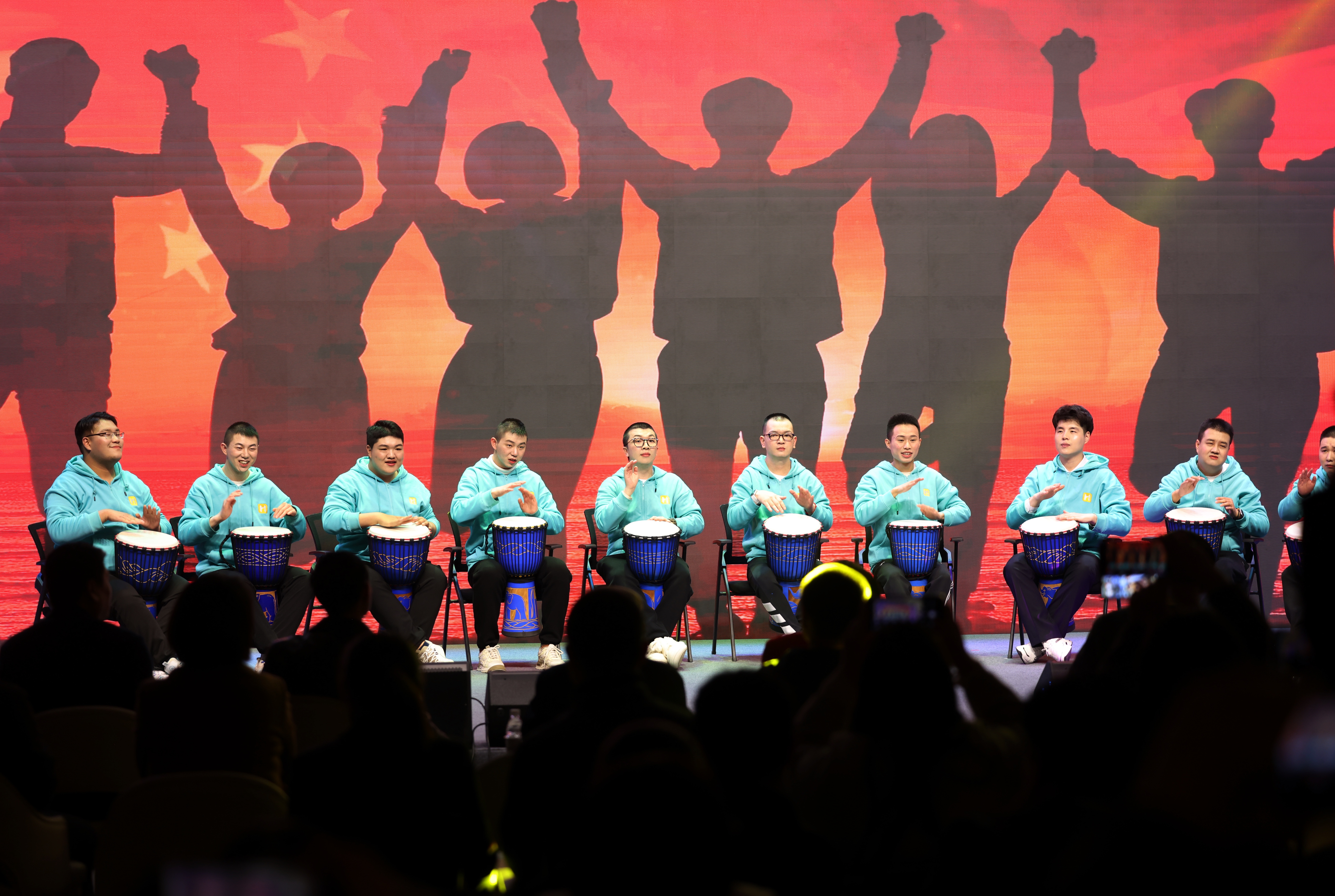 智选职康站表演非洲鼓合奏《少年》。新京报记者 王贵彬 摄