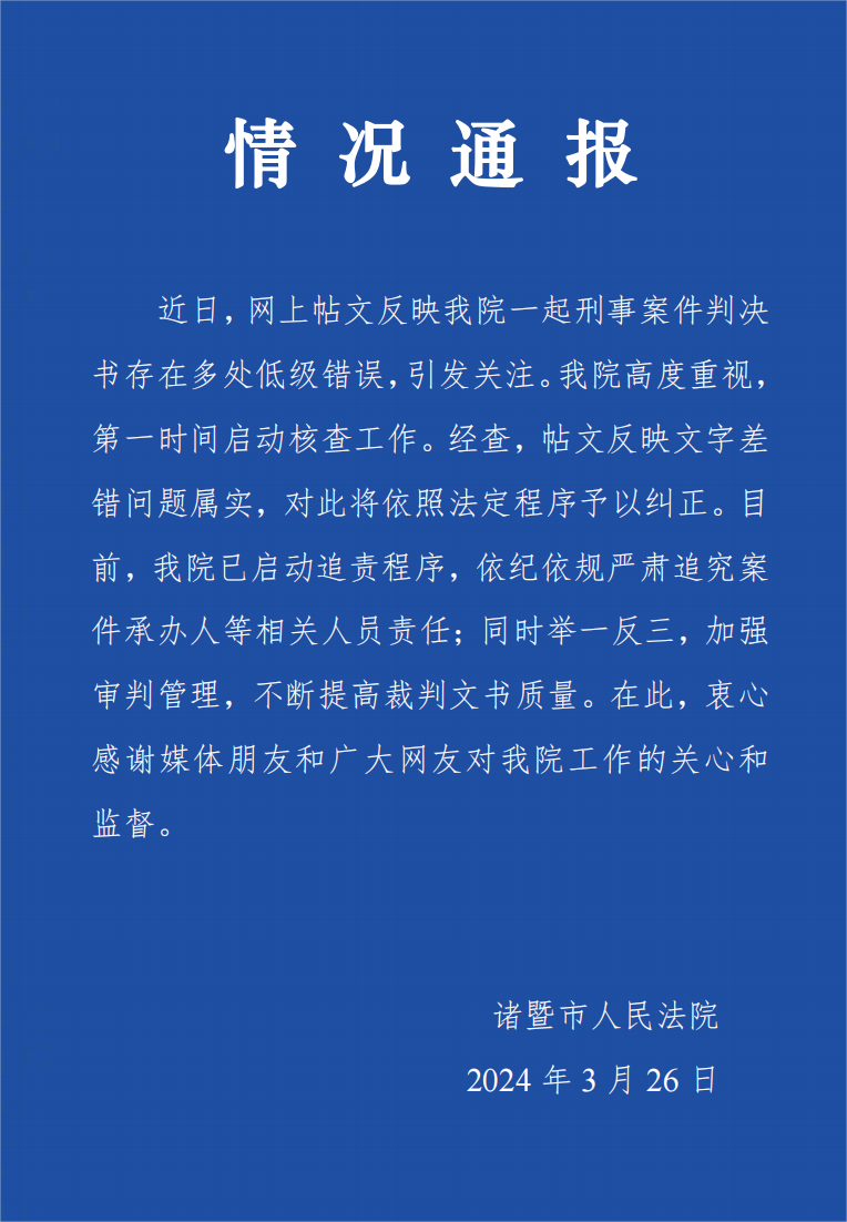 浙江诸暨法院回应判决书出现百余处错误:属实,已启动追责程序
