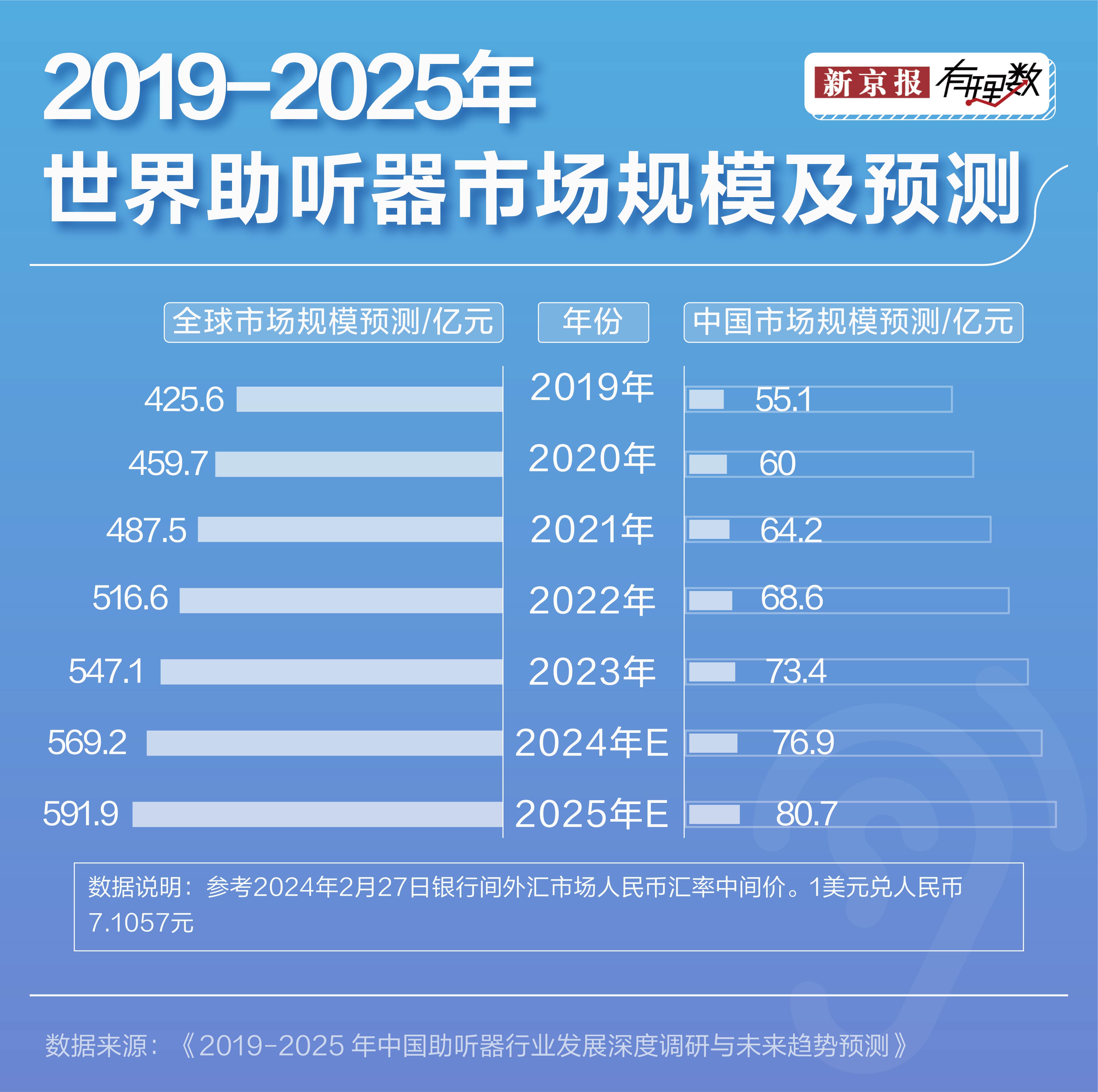 《2019-2025年中国助听器行业发展深度调研与未来趋势预测》显示,预计到2025年,全球助听器的市场规模有望接近600 亿元。与此同时,我国助听器市场规模可突破80亿元。