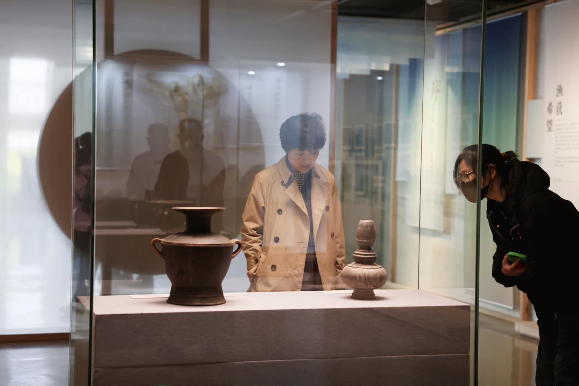 观众在观看傣族黑陶水瓶和藏族云雷莲花纹陶罐。 新京报记者 浦峰 摄