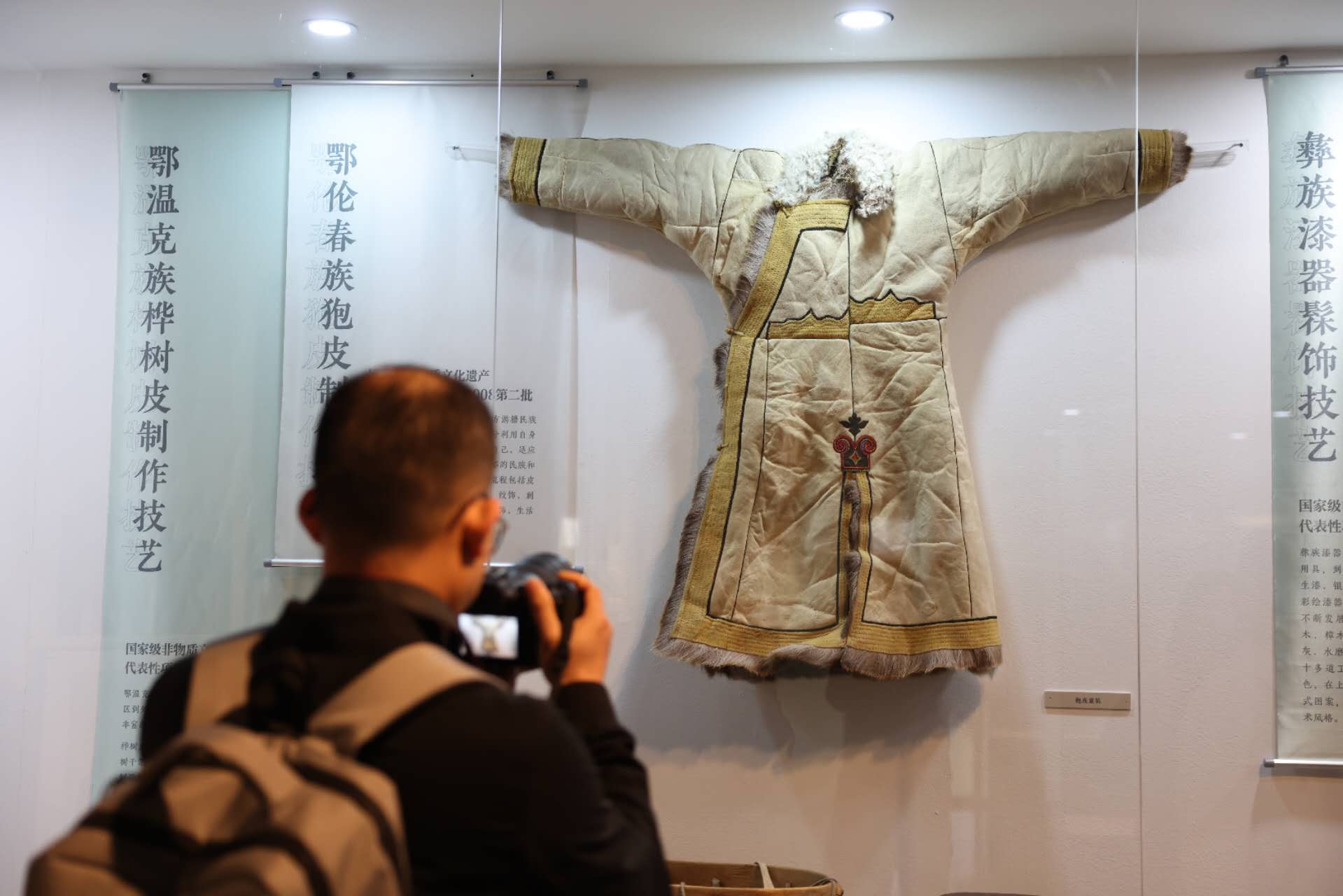 观众在观看一件鄂伦春族的狍皮。鄂伦春族狍皮制作技艺于2008年入选国家级非物质文化遗产代表性项目名录。 新京报记者 浦峰 摄