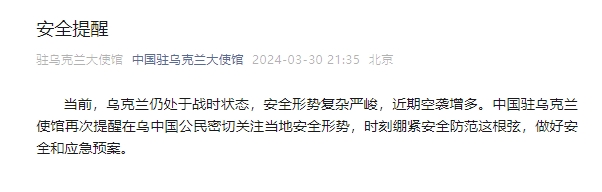 新京报讯 据中国驻乌克兰大使馆官微消息,当前,乌克兰仍处于战时状态,安全形势复杂严峻,近期空袭增多。中国驻乌克兰使馆再次提醒在乌中国公民密切关注当地安全形势,时刻绷紧安全防范这根弦,做好安全和应急预案。