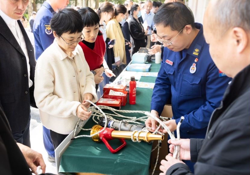 活动现场,消防救援员介绍灭火器具的使用方法。图源:浙江省应急管理厅