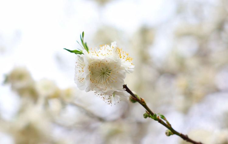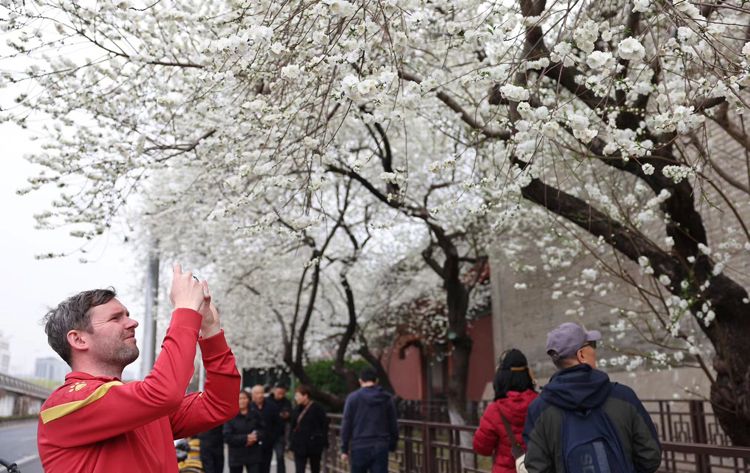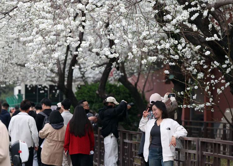 碧桃花开,色白如雪,引得众多市民、游客驻足观赏。