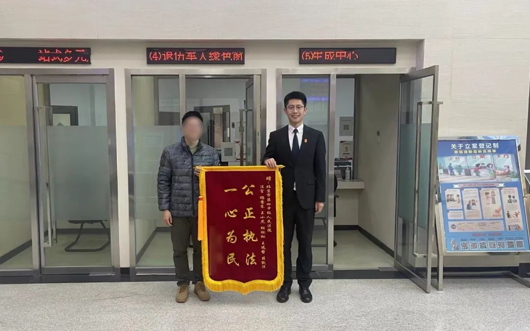 某国外金融公司诉讼代理人(左)受托向北京四中院赠送锦旗。北京市第四中级人民法院供图