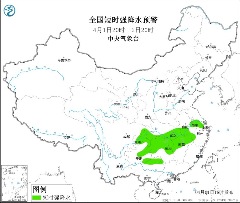 全国短时强降水预警(4月1日20时-2日20时)。图/中央气象台