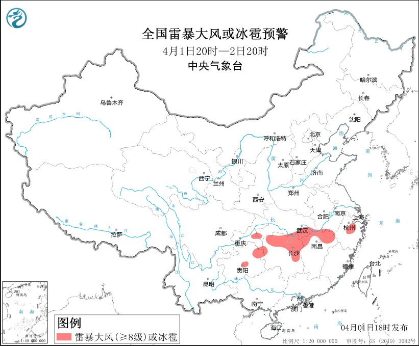 全国雷暴大风或冰雹预警(4月1日20时-2日20时)。图/中央气象台