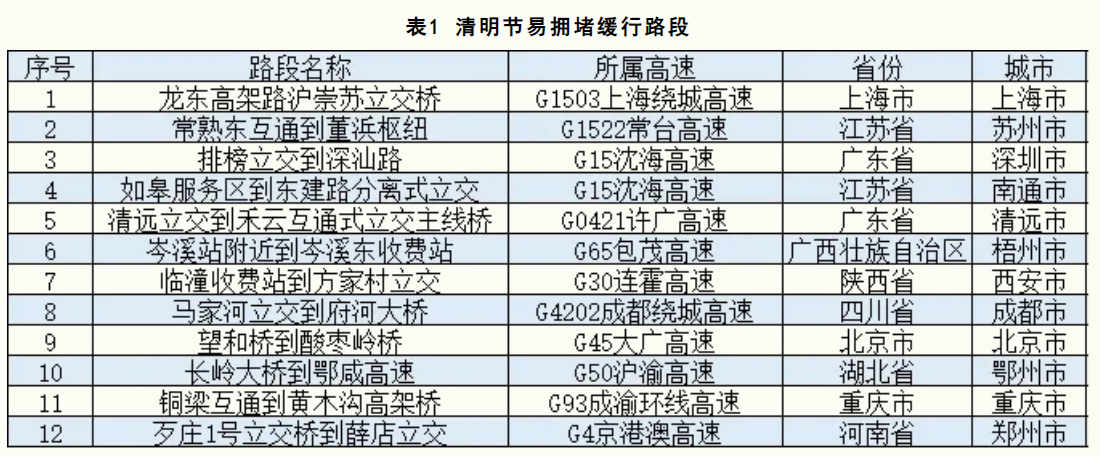 清明节期间,全国高速公路预计易发生拥堵缓行的路段,如表1所示。