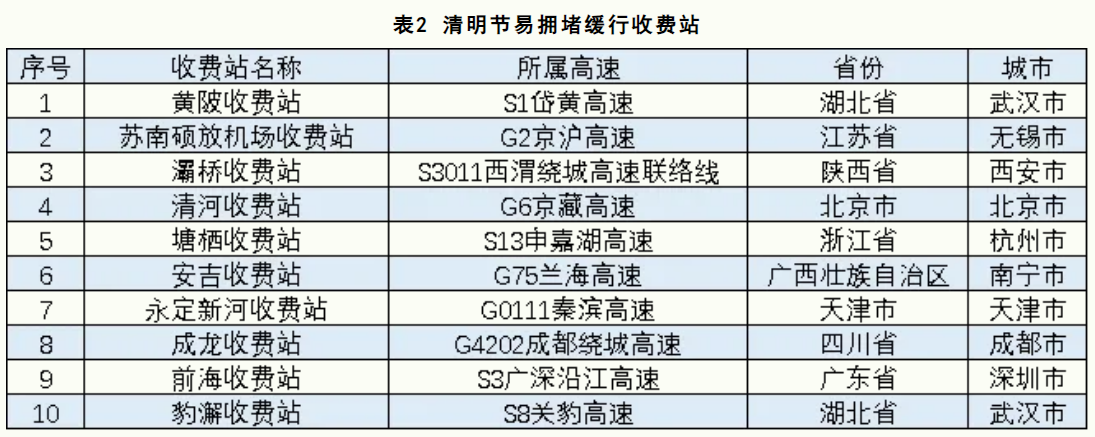 清明节期间,全国高速公路预计易发生拥堵缓行的收费站,如表2所示。