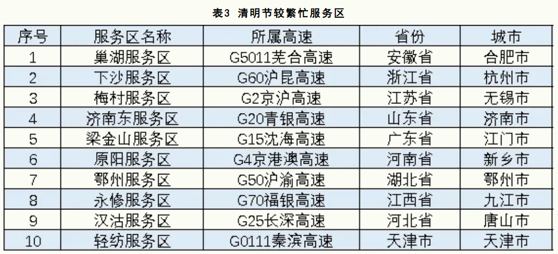 清明节期间,全国高速公路预计较繁忙的高速公路服务区,如表3所示。