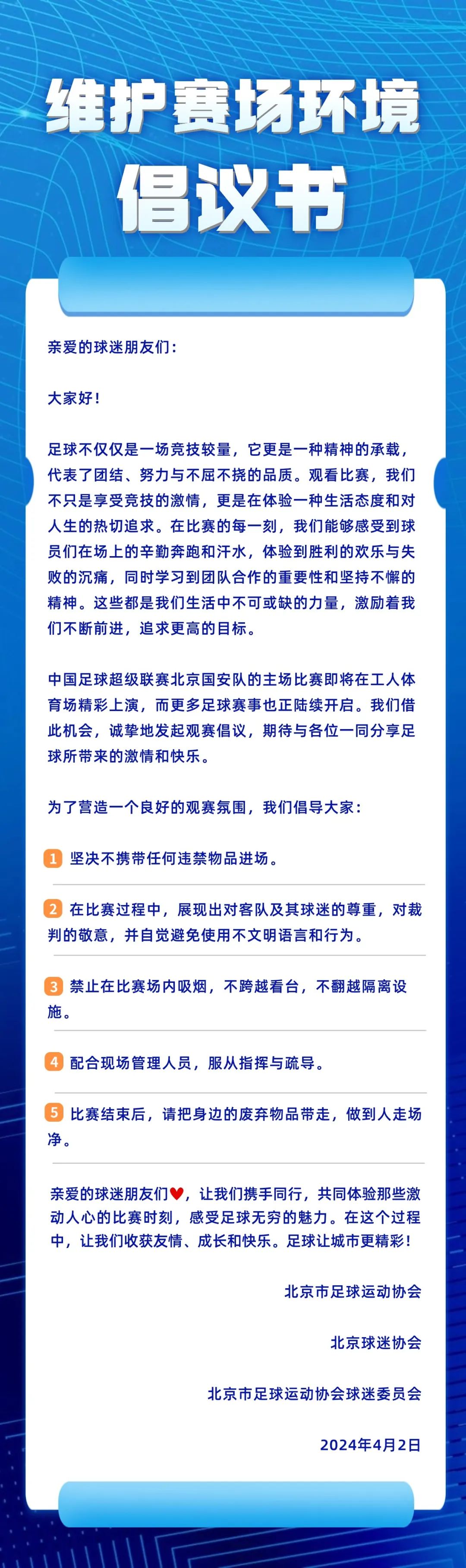 新京报讯 4月5日19:35,中超第四轮,北京国安将迎来新赛季首个主场比赛,在工人体育场迎战上海海港。4月2日,北京足协发布维护赛场环境倡议书,包括:坚决不携带任何违禁物品进场;在比赛过程中展现出对客队及其球迷的尊重,对裁判的敬意,并自觉避免使用不文明语言和行为;禁止在比赛场内吸烟,不跨越看台,不翻越隔离设施;配合现场管理人员,服从指挥与疏导;比赛结束后,请把身边的废弃物品带走,做到人走场净。