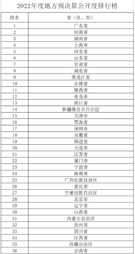 据新华社消息,财政部4月2日对外发布“2022年度地方预决算公开度排行榜”,广东、河南、湖南位居榜单前三名。这是2015年以来,财政部第7次在全国范围内开展地方预决算公开检查。