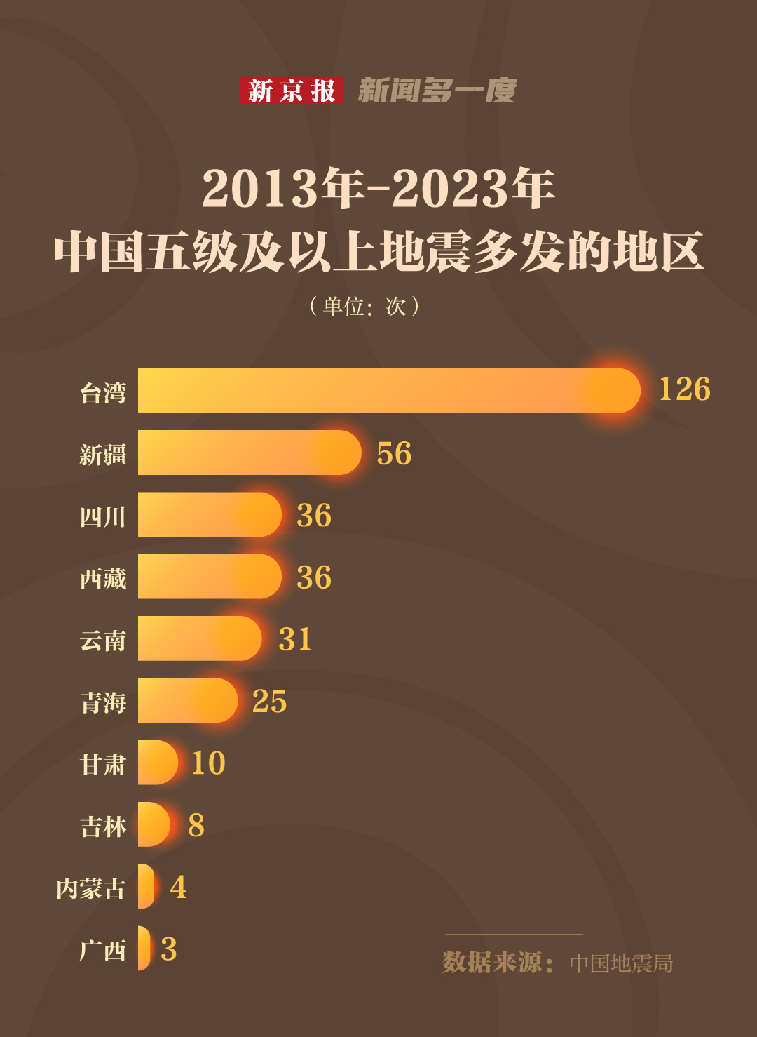 根据中国地震局公布的地震记录,近10年来,台湾地区为我国发生五级及以上地震最多的地区,超过100次。