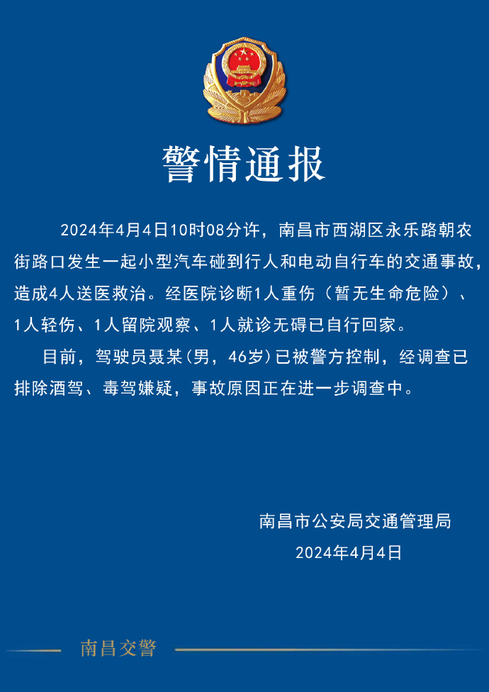 新京报讯 据@南昌交警消息,2024年4月4日10时08分许,江西省南昌市西湖区永乐路朝农街路口发生一起小型汽车碰到行人和电动自行车的交通事故,造成4人送医救治。经医院诊断1人重伤(暂无生命危险)、1人轻伤、1人留院观察、1人就诊无碍已自行回家。