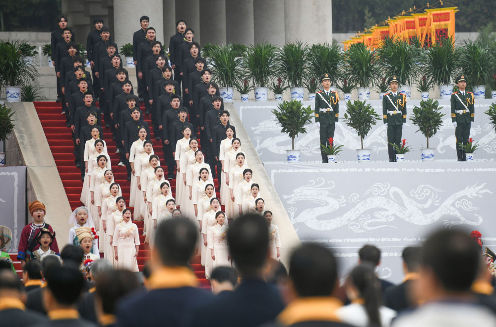 4月4日,演员在公祭轩辕黄帝典礼上演唱歌曲《黄帝颂》。新华社记者 张博文 摄