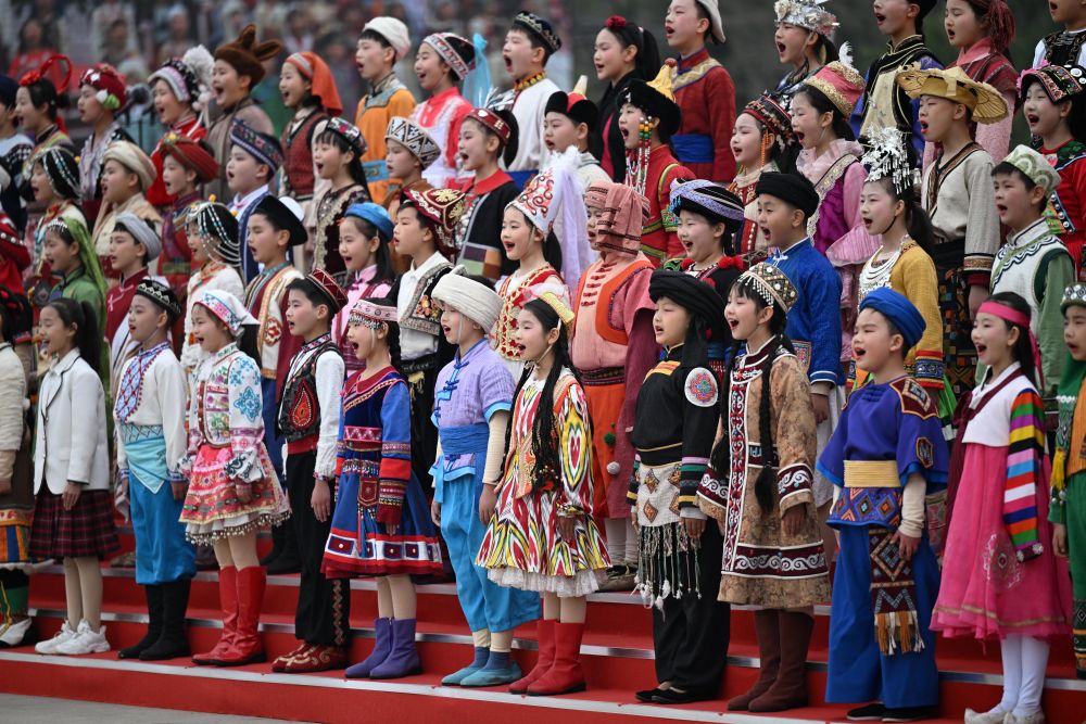 4月4日,身穿民族服饰的儿童在公祭轩辕黄帝典礼上合唱《黄帝颂》。新华社记者 陈晔华 摄