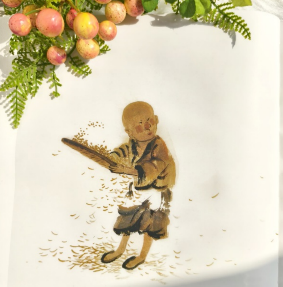 扉页上画有一盏灯,从《宝儿》那里就点亮了,一路点过来。我还想画这盏灯,因为我希望大家能做传灯的人。我希望这盏灯出现在和尚的小庙里,也出现在其他的作品里,更出现在我们文化传播人的心中。让孩子们循着这盏灯的光亮前行,追寻人生的光明。